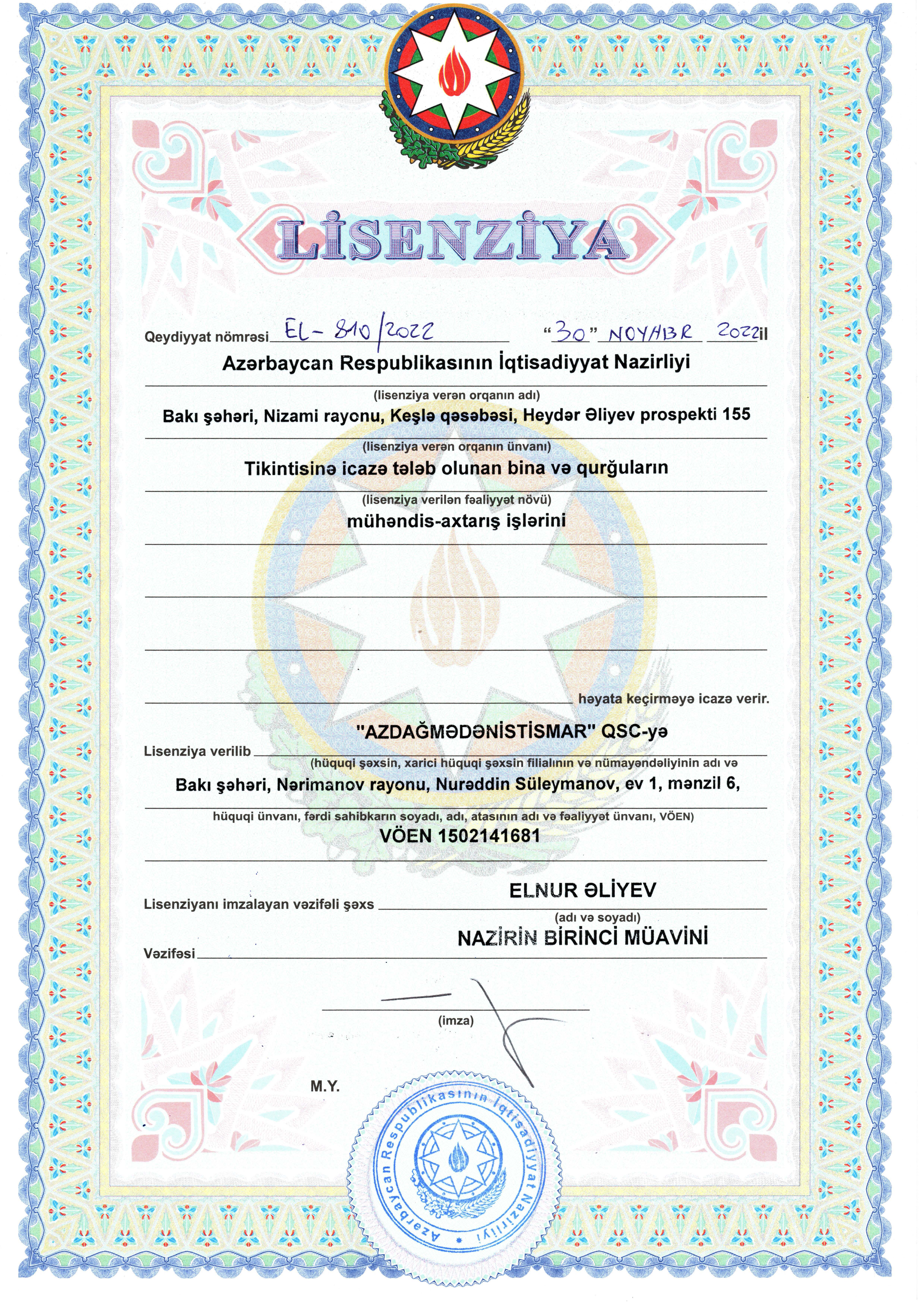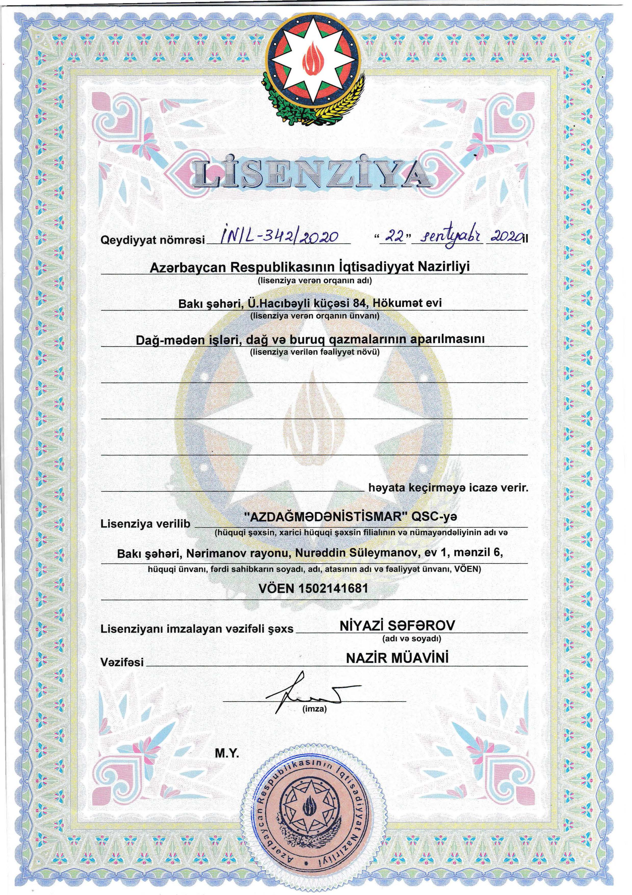 Azdağmədənistismar LLC operates in strict compliance with the applicable legislation of the Republic of Azerbaijan and holds the following principal licenses and permits issued by the competent state authorities: