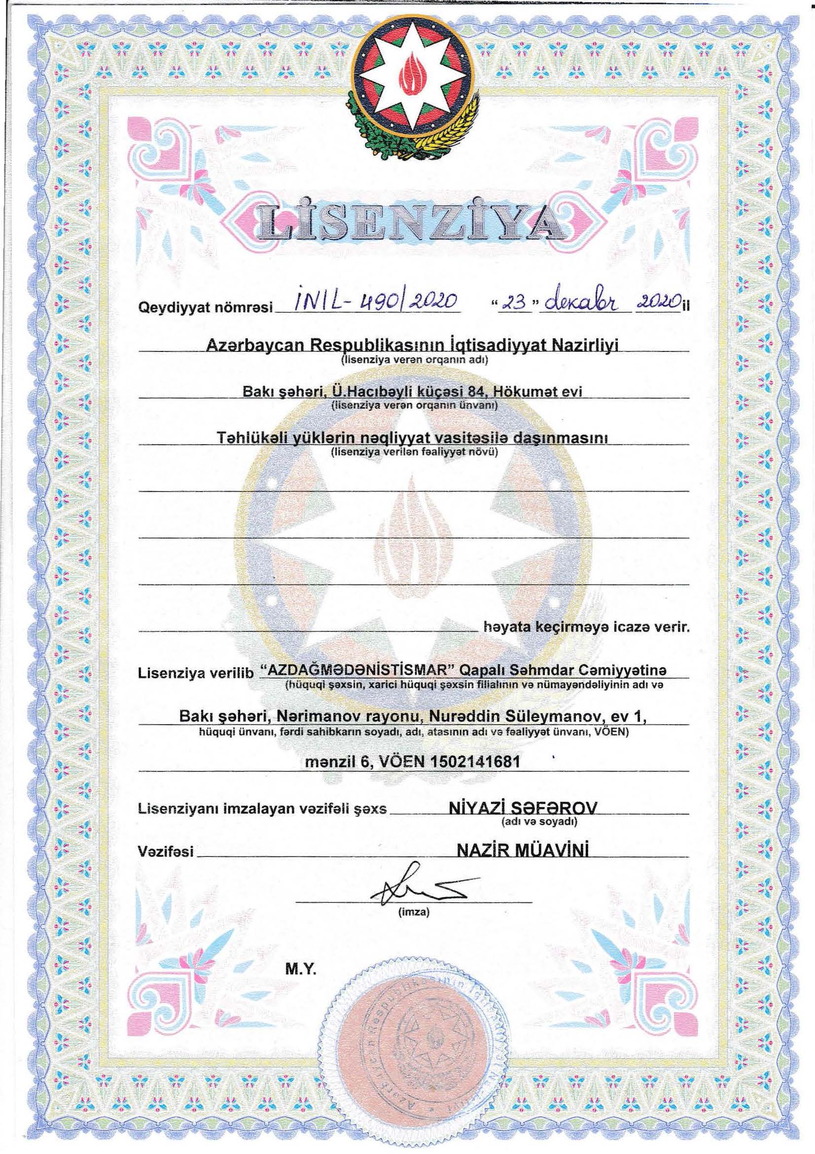 Azdaghmadanistismar LLC holds all required licenses and official authorizations mandated by the legislation of the Republic of Azerbaijan to operate in the mining and drilling sectors.
